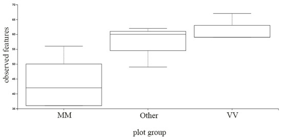 α-diversity box-plot considering OTU number in parcels from Monção and Melgaço region (MM), Vinho Verde region (VV) and all the rest parcels analyzed (Other).