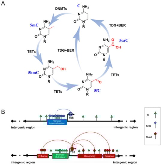Another family, named Ten-eleven translocation (TET) dioxygenases, is responsible for catalyzing the iterative oxidation of 5mC to 5-hydroxymethylcytosine (5hmC), 5-formylcytosine (5fC), and 5-carboxylcytosine (5caC) on DNA. The TET family in mammals contains Tet1, Tet2, and Tet3, which share a homology catalytic domain at their C terminal. 5fC and 5caC are then specifically recognized by thymine DNA glycosylase to trigger the base excision repair (BER) process, leading to their final conversion to unmethylated cytosine (Figure 1A) [22,23]. Originally, this process was thought to be just an active DNA demethylation with 5hmC, 5fC, and 5caC as transient intermediates. Proteome-wide profiling showed that these modifications may recruit different transcriptional regulators (as readers) to regulate gene expression (Figure 1B) [24,25]. This suggests that novel forms of DNA methylation provide potential regulatory mechanisms for genome functions. Due to the limitations of detection methods for 5fC and 5caC, most studies have focused on the biological functions of 5hmC.