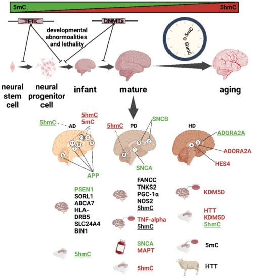 The brain is the most important organ that serves as the center of the nervous system in mammals. The function of the brain is to control and coordinate a wide variety of actions and reactions, especially thought, memory, and emotion in primates. The development and aging of the brain are complex processes that depend on multiple layers of precise regulation. During aging, the brain shrinks and changes structurally and is predisposed to neurodegenerative diseases. Alzheimer’s disease (AD), Parkinson’s disease (PD), and Huntington’s disease (HD) are common neurodegenerative diseases that cause progressive loss of neuronal function and lead to cognitive impairment. Epigenetic mechanisms play essential roles in brain function by regulating gene expression [1,2,3]. As a critical epigenetic modification, DNA methylation affects transcriptional activity by recruiting or inhibiting the binding of transcription factors to DNA. Many brain disorders display altered gene expression, and accumulating evidence implicates dynamic DNA methylation in altered gene expression and pathological processes in the brain [4,5]. Dysregulation of the epigenome has been reported in neurodevelopmental and neurodegenerative diseases [6].