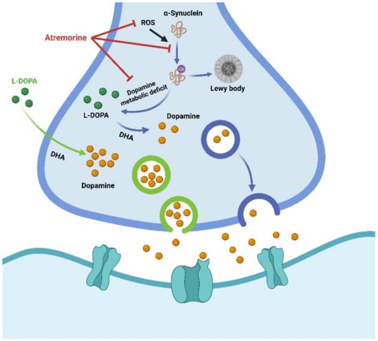 Schematic diagram of L-DOPA and atremorine against MPTP-induced dopaminergic neurodegeneration. Atremorine has an antioxidant impact, including inhibition of reactive oxygen species (ROS), restoration of total ROS levels, and a significant improvement in total antioxidant capacity. Atremorine inhibits the ubiquitin-proteasome system and accumulation of α-synuclein to regulate dopamine/L-Dopa levels in the brain and exhibits neuroprotective effects. Dopamine levels can also be regulated by direct supplementation with L-DOPA.