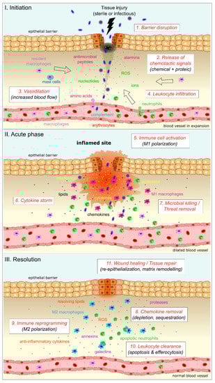 The inflammatory response is initiated by the detection of molecular signals that are produced either by microbial invaders (pathogen-associated molecular patterns, PAMPs) or by endogenous cells (danger-associated molecular patterns, DAMPs) [,]. This very first line of defense relies on multiple components of the innate immune system, both at the cellular and molecular level, in order to insure rapid and efficient integration of the signals. Increase of blood flow, coupled to the generation of chemotactic gradients, allows leukocytes to rapidly migrate and infiltrate the damaged tissue [,]. Neutrophils are massively recruited at first, followed by macrophages []. Together with resident cells, they release numerous inflammatory mediators through various mechanisms such as neutrophil extracellular traps (NETs), active secretion, passive diffusion, or even necrosis [,,].