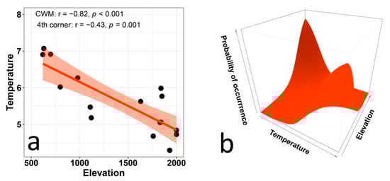 As expected, CWM values of temperature preferences (Figure 1a) decreased distinctly with elevation, and the fourth-corner analysis supported the statistical significance of this relationship. Results from the multi-level approach (Figure 1b) showed a strong relationship between plant preferences for temperature and elevation: species that prefer high temperatures occurred at lower elevations and species that prefer low temperatures occurred at higher elevations. The ANOVA results indicate that the trait × environment interaction significantly improves the model (p < 0.001), whereas the fixed effects only explain 6% of the variation.