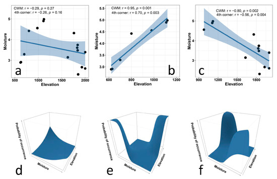 Relationship between Ellenberg indicator values for moisture and elevation in plant communities along an elevational gradient in Central Italy. The upper panels (a–d) present CWM regression models and their statistical corrections using fourth-corner analysis for the entire gradient (a), for the lower subgradient (b), and for the upper subgradient (c). The lower panels (d–f) illustrate the results of multi-level models for the entire gradient (d, trait × environment interaction p < 0.01, marginal R2 = 0.02), for the lower subgradient (e, trait × environment interaction p < 0.001, marginal R2 = 0.21), and for the upper subgradient (f, trait × environment interaction p < 0.001, marginal R2 = 0.13).