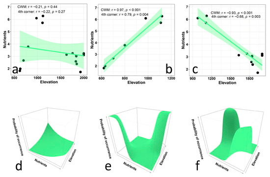 Relationship between Ellenberg indicator values for nutrients and elevation in plant communities along an elevational gradient in Central Italy. The upper panels (a–d) present CWM regression models and their statistical corrections using fourth-corner analysis for the entire gradient (a), for the lower subgradient (b), and for the upper subgradient (c). The lower panels (d–f) illustrate the results of multi-level models for the entire gradient (d, trait × environment interaction p < 0.01, marginal R2 = 0.01), for the lower subgradient (e, trait × environment interaction p < 0.001, marginal R2 = 0.13), and for the upper subgradient (f, trait × environment interaction p < 0.001, marginal R2 = 0.15).