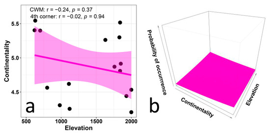CWM regressions, fourth-corner analyses, and multi-level analyses indicate that the values of EIVs for continentality do not vary with elevation in any obvious way. This is consistent with our hypothesis of a lack of relationship. We can expect that continentality preferences may vary distinctly with latitude and longitude, as a function of distance from the sea, more than with elevation, at least in short gradients. Thus, it is not surprising that this aspect of ecological preferences is of scarce relevance for our elevational gradient, and confirms that, in general, continentality values vary without meaningful patterns [69,70,71].