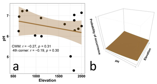- The EIVs for soil reaction (pH) should increase with elevation because of decreasing values of soil pH. Soil pH tends to decrease with elevation due to the slow decomposition of organic matter (which releases acids) and higher precipitation, which increases the leaching of basic cations [64,65,66,67,68].