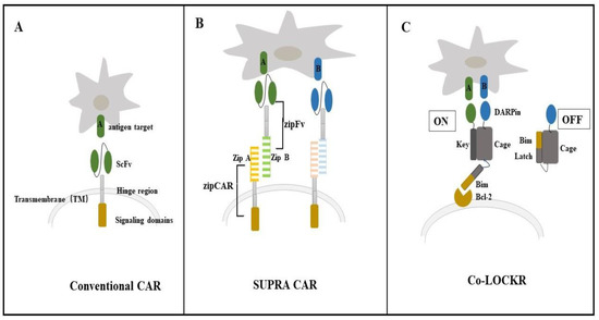 - Cho, J.H.; Collins, J.J.; Wong, W.W. Universal Chimeric Antigen Receptors for Multiplexed and Logical Control of T Cell Responses. Cell 2018, 173, 1426–1438. [Google Scholar] [CrossRef]