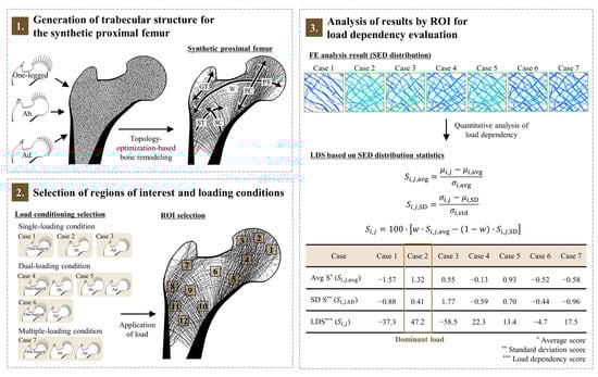 This study quantitatively analyzed the uniformity of the SED distribution for each ROI in the synthetic femur model under various loading conditions. The LDS was used as a measure of the dependency between the trabecular bone structure and a specific loading condition. The results showed that the trabecular structure in a given ROI primarily depended on a particular loading condition, called the dominant loading condition. Furthermore, it was confirmed that the uniformity of the SED distribution and the average SED value should be considered simultaneously when analyzing the load effects both qualitatively and quantitatively. The results of the analyses provided an in-depth understanding of the spatial characteristics of each ROI. Furthermore, these findings can help improve the computational efficiency of bone remodeling simulation methods. As a dominant load is used rather than several loading conditions, this work may increase the computational efficiency of bone remodeling simulation approaches. As a proof of concept, this study provides a basis for local bone reconstruction using only specific loads with high load dependency in the future and a basis for expanding the study to the validation of real bone.