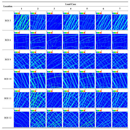 The effect of external loads on the ROI transferred by the bone microstructure was clearly demonstrated by the LDS, which considers the SED average as well as its standard deviation. A low LDS value was evident when the load effect was small because the external load was not transferred to the ROI. The low influence of the load under specific loads for each ROI can be verified visually using qualitative measurements. As a representative example, the overall average of the SED distribution in ROI 1 under load case 2 was relatively small, as shown in Figure 7. As shown in Table 3, this ROI exhibited a very low LDS value (−35.13), which effectively and quantitatively expressed that the load dependency was very low. Moreover, the low SD. S1,2 value (−1.18) and low Avg. S1,2 value (−1.83) indicated that the SED distribution was rather uniform, however, the final load dependency was low owing to the insignificant influence of the load transferred to the ROI. Conversely, when the load was effectively transmitted to the ROI and the SED was uniformly distributed, as in ROI 2 under load case 7 (Figure 7), the LDS was relatively high (here, 77.01, as shown in Table 3). This is because SD. S2,7 has a very low value (−0.95) and Avg. S2,7 has a very high value (0.60) (Table 3) simultaneously.