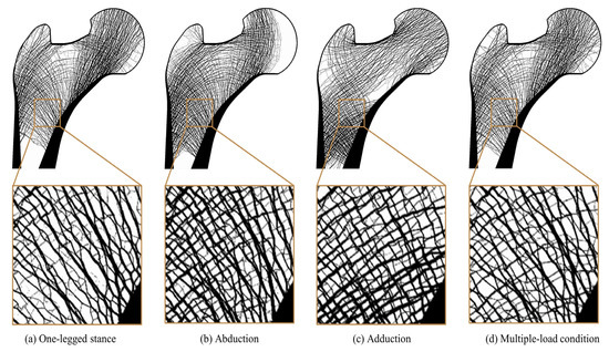 Morphological change in trabecular architecture of proximal femur for (a–c) single-loading conditions and (d) multiple-loading condition.