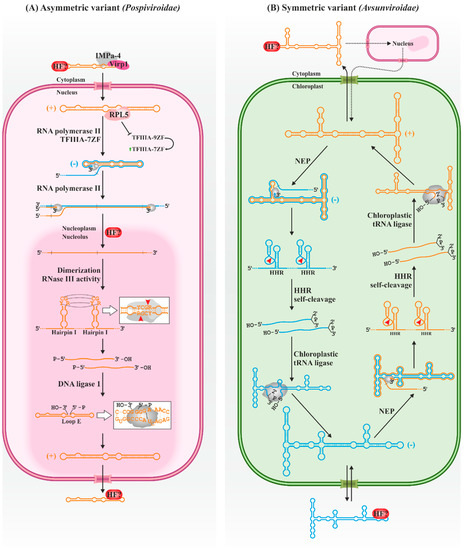 The rolling-circle mechanism in its (A) asymmetric and (B) symmetric variants is proposed for the replication of viroids of the families Pospiviroidae in the nucleus and Avsunviroidae in chloroplasts, respectively. In both cases, the positive and negative viroid RNA polarities are represented in orange and blue, respectively. Host proteins and viroid RNA motifs involved in the replicative cycle are indicated. Arrowheads indicate RNA cleavage sites. -P, -OH and >P, 5′-phosphate, 5′-hydroxyl and 2′,3′-phosphodiester groups, respectively; HF?, unknown host factor; HHR, hammerhead ribozyme; IMPa-4, importin alpha-4; NEP, nuclear-encoded chloroplastic DNA-dependent RNA polymerase; RPL5, ribosomal protein L5; TFIIIA-7ZF/-9ZF, transcription factor IIIA splicing variants with seven or nine zinc fingers, respectively; and Virp-1, bromodomain-containing protein 1.