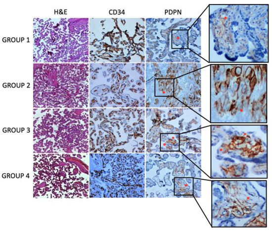 Since the first trimester is the most important period for the formation of the placental vasculature, and abnormalities in the vessels are visible in group 2, one might assume an alteration in PDPN expression, as found in groups 3 and 4, and a subsequent compensatory reaction, which is able to bring PDPN levels back to normal, while the abnormalities remain. Probably in groups 3 and 4, being in a period in which the vascular network is already defined, alterations in the vessels are not easily detected while altered PDPN expression persists.