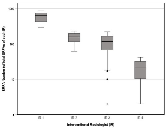 The median number of previously performed SRFAs at the time of procedures was 643 (range 296–864) for IR 1, 157.5 (62–231) for IR 2, 117.5 (1–220) for IR 3, and 21 (1–42) for IR 4, where differences between IR 4 and experienced IRs were statistically significant (p = 0.000). Figure 3 summarizes these results.