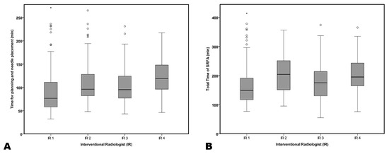 Boxplot comparison of time needed for (A) planning/placement and (B) the whole procedure grouped by interventional radiologists (IR). IR 1 reflects the most and IR 4 the least experienced operator.