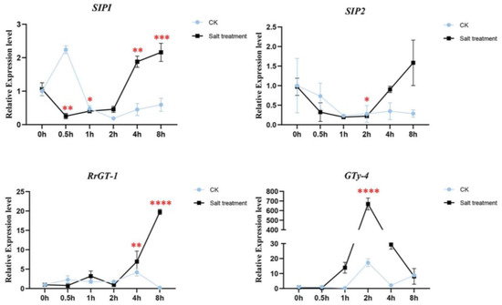 The salt responsive expression levels of RrGTγ-4, RrSIP1, RrSIP2 and RrGT-1 in roots of R. rugosa. The wild R. rugosa seedings were treated by water (CK) and 340 mM NaCl solution (Salt treatment) from 0.5 h to 8 h. Untreated seedings were the reference samples (0 h). *, **, *** and **** indicated the threshold value of significance of t-test 0.05, 0.01, 0.001 and 0.0001, respectively.