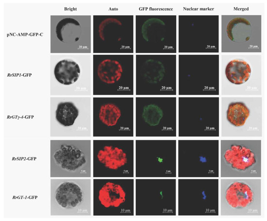 The fusion proteins of RrSIP1-GFP or RrGTγ-4-GFP (green) overlapped with chloroplasts (red) indicated that RrSIP1 and RrGTγ-4 were located on chloroplasts. The colocalizations (cyan) of fusion proteins (green) and nuclear marker (blue) indicated that RrGT-1 and RrSIP2 were located on nucleus (Figure 6).