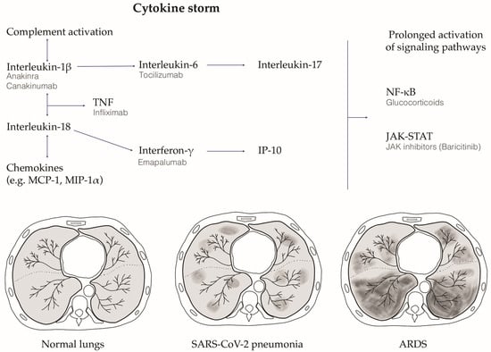 The SARS-CoV-2 infection induced cytokine storm and the relative lung damage. After SARS-CoV-2 infection, an innate and adaptive immune response is activated, which leads to the release of high amounts of pro-inflammatory cytokines (the cytokine storm schematically reported in the figure). This process clinically manifests first with respiratory failure and interstitial pneumonia, which are typically characterized by diffuse ground glass opacifications detected using high-resolution computed tomography. The more this process auto-amplifies, the higher is the risk for the patient to develop acute respiratory distress syndrome (ARDS) and multiorgan failure, which can finally lead to death. The figure schematically depicts axial slices from high-resolution computed tomography (HRCT) showing normal lungs, SARS-CoV-2 interstitial pneumonia with the typical ground glass opacifications, and the end-stage ARDS. Therapeutic strategies experimented in COVID-19 targeting the cytokine storm pathways are also depicted. TNF, tumor necrosis factor; NF-kB, nuclear factor kappa B; JAK-STAT, Janus kinase—signal transducers and activators of transcription; Monocyte Chemoattractant Protein-1, MCP-1; Macrophage Inflammatory Protein-1 Alpha, MIP-1 alpha; Interferon gamma-induced protein 10, IP-10.