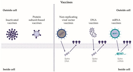Non-replicating viral vector vaccines: Inactivated adenoviruses are commonly adopted as vectors in non-replicating viral vector vaccines [90]. This approach has been tested for the development of vaccines against SARS-CoV-2. Non-replicating viral vector vaccines can induce a strong humoral and cellular immune response, and they show good safety and immunogenicity, guaranteeing high titers of antibodies directed against the spike protein of SARS-CoV-2 [91]. However, adenoviruses are among the most common agents of respiratory infections; thus, a limitation of adopting this virus as a vaccine vector might lie in previous immunization to strands of adenovirus similar to the one adopted as a vector with a consequent decrease in efficacy [92]. For this reason, commercially available non-replicating viral vector vaccines for SARS-CoV-2 are based on non-human specific adenovirus or less-common human-specific adenoviral vectors, i.e., Ad26 and Ad35 [93,94].