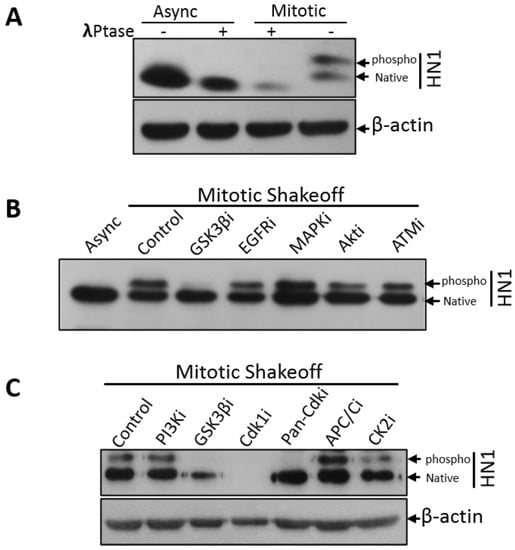 To determine whether the larger band (around 25 kDa) is a phosphorylated form of HN1, Lambda (λ) phosphatase treatment was performed in mitotic cell lysates, and the phospho-HN1 form was observed to be depleted upon phosphatase treatment, hence suggesting that HN1 is partially phosphorylated in mitosis (Figure 2A). Native HN1 also keeps up the original expression level at mitosis, suggesting that the HN1 expression and its phosphorylations are tightly regulated at mitotic transition and further in the cell cycle. Furthermore, different kinase inhibitors were applied to mitotic populations collected, as shown in Figure 1A and Figure S1, to determine the upstream kinases of HN1. The inhibitor treatment duration was 3 h in the Nocodazole block and 1-h release (total 4 h of inhibitor treatment) to explicitly inhibit the kinases in mitosis. Specific kinase inhibitors for GSK3β, EGFR, MAPK, AKT, and ATM were used and the GSK3β inhibitor treatment led to a significant depletion of the upper band of HN1, suggesting that HN1 is phosphorylated in mitosis by GSK3β (Figure 2B). Moreover, the effect of the inhibitors of PI3K, Cdk1, Pan-Cdks, along with APC/C inhibitor (TAME), and Casein kinase II with the GSK3β inhibitor as a control was also determined using the same procedure as described in Figure 1C. It was observed that the Cdk1 inhibitor (RO-3306, 10 μM) completely depleted the native and phosphorylated forms of HN1 (Figure 2C). The Pan-Cdk inhibitor (Flavopiridol, 500 nM) also led to a significant decrease in the HN1 phospho-form. These experiments were repeated and it was observed that RO-3306, even at lower concentrations, also led to a clear reduction in the expression of the HN1 phospho-form (Supplementary Material, Figure S2). CDK1i treatment of PC3 cells led to a significant decrease in HN1 expression during mitosis. Therefore, CDK1 kinase-related phosphorylation of HN1 could be functional and has to be explored further.