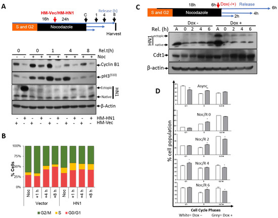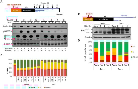 HN1 overexpression before Nocodazole Block (post-G2) using the transient transfection and Doxycycline inducible system: (A) The design of the first experimental approach is given where HN1 was overexpressed using HM-HN1 and the control vector (HM-Vec) was used as the control. Cyclin B1 and p-H3(S10) levels decreased in HN1-overexpressing cells treated with Nocodazole and released at different times. (B) After 16 h of Nocodazole treatment, cells were released from the Nocodazole block and were analyzed using flow cytometry 0, 15, and 30 min and at 1, 4, and 8 h later. When HN1 was ectopically expressed before the Nocodazole block, a considerable number of cells accumulated in the S phase as shown in the yellow populations. (C) PC3 cells transduced with pCW57-HM-HN1 viruses were selected with puromycin and the stabilized cell line was generated. Furthermore, to determine the impact of HN1 induction using Doxycycline before Nocodazole Block (post-G2), cells were given Doxycycline 6 h before Nocodazole. The cells were kept in Nocodazole for 16 h and released at indicated times. HN1 induction was validated with immunoblotting using an anti-HN1 antibody, and anti-β-actin was used as a loading control. (D) The samples (Async, Noc 0 h, and Noc 4 h indicating release from Nocodazole block (post-G2) to exit from mitosis and entry into G1) were subjected to cell fixation and PI staining followed by flow cytometry.