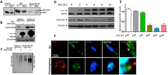 Cyclin B1 degradation occurs via proteasomal degradation [27] in HN1 overexpressed cells through proteasome machinery. Therefore, we transfected PC3 cells with HN1-overexpressing and/or an empty vector. The cells were also treated with the proteasome inhibitor MG132 or with DMSO. Interestingly, HN1 overexpression-mediated substantial decrease in Cyclin B1 level was reversed with MG132 treatment (Figure 5B). Since Cyclin B1 degradation depends on increased ubiquitination, HN1 could potentially contribute to Cyclin B1 degradation through its ubiquitination. To test this hypothesis, lysates from HN1-transfected PC3 cells were used for determining the Cyclin B1 ubiquitination level (Figure 5C). Our results revealed that HN1 overexpression is associated with increased rates of Cyclin B1 ubiquitination. The effect of HN1 overexpression using the Tet-ON system is also shown (Figure 5D,E). With the increase in the duration of Doxycycline treatment, HN1 ectopic levels increased; meanwhile, Cyclin B1 protein levels decreased. Moreover, HN1 localized with Cyclin B1 in the G2 and prometaphase phase as observed in immunofluorescence microscopy (Figure 5F). The immunofluorescence data complies with the immunoprecipitation data (Figure 5A), where cells synchronized in post-G2 using the Nocodazole block show specific interaction of Cyclin B1 with HN1.
