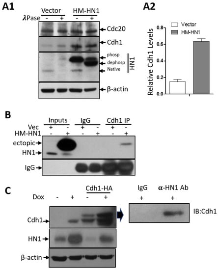 HN1 stabilizes and interacts with Cdh1. (A1) The effect of HN1 overexpression on phosphorylations of Cdc20 and Cdh1 was queried using λ-phosphatase assay on protein lysates collected after vector and HM-HN1 transfections in PC3 cells. Anti-β-actin was used as the loading control of the experiment. (A2) The Cdh1 protein levels normalized to β-actin are shown. (B) Since Cdh1 is the co-factor of APC/C, which was stabilized upon HN1 overexpression, Vector and HM-HN1 transfected samples were subjected to immunoprecipitation using the anti-Cdh1 antibody and immunoblotted with the anti-HN1 antibody. In all immunoprecipitation assays, control IgG antibodies from the same host as IP antibodies were utilized. (C) DU-145 cells stabilized with pCW57-HM-HN1 viruses were induced with Doxycycline (1 ug/mL) and also transfected with Cdh1-HA plasmid (Addgene No. 11596) to observe changes in Cdh1 and HN1 levels with immunoblotting. HN1 overexpression with Doxycycline led to the stabilization of Cdh1 levels, while Cdh1 overexpression decreased HN1 levels. The sample with both Cdh1 and HN1 overexpression was subjected to immunoprecipitation using an anti-HN1 antibody crosslinked with Dynabeads G and immunoblotted with an anti-Cdh1 antibody. HN1 interacted with Cdh1 in this sample.