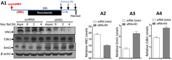 HN1 depletion using siRNA leads to the stabilization of CDK1 and Emi1. (A1) PC3 cells were either given scrambled control RNA or siRNA targeting HN1 (siHN1), treated with Nocodazole for 18 h, and released into G1 for up to 4 h by replacing Nocodazole with fresh media. The cells were subjected to protein isolation and subsequent western blotting, where the relative levels of HN1, Cdk1, and Emi1 were measured using immunoblotting, and anti-β-actin was used as the loading control of the experiment. The relative HN1 levels (A2), Emi1 levels (A3), and Cdk1 levels (A4) are measured using densitometry analysis normalized to β-actin.