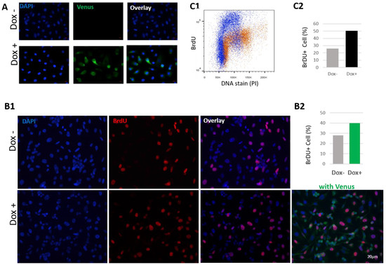 HN1 is directly associated with the progression of the S phase. (A) PC3 cells transduced with pCW57-HN1-Venus viruses were selected with puromycin (2 μg/mL), plated on coverslips and induced with Doxycycline for 2 days, fixed with 4% paraformaldehyde, and analyzed using fluorescence microscopy to validate the expression of HN1-Venus. DAPI was used to stain nuclei. (B1) PC3 cells stabilized with pCW57-HN1-Venus were induced with Doxycycline for 2 days and BrdU was applied 2 h before cell fixation. Anti-BrdU staining was performed (secondary anti-mouse Alexa Fluor-594) to observe cells actively undergoing DNA synthesis, where DAPI was used for nuclei staining. (B2) BrdU positive cells counted (from B1) were graphed and it was observed that HN1-Venus expressing cells produced significantly higher amounts of BrdU positive cells. The mean number of BrdU+ cells in Dox− samples were 36/129 nuclei and in Dox+ samples were 57/143. The graph indicates the mean percentages of BrdU+ cells. (C1) PC3 cells stabilized with pCW57-HM-HN1 viruses were subjected to Doxycycline induction of ectopic HN1 expression and BrdU treatment (as performed in (B) and cells were fixed in ethanol (70% in PBS)). After PI and anti-BrdU staining, cells were analyzed in a flow cytometer, and it was observed that HN1 overexpressing cells exhibited higher levels of BrdU-stained cells. The representative image processed with the population-gating procedure is shown. (C2) The mean number of BrdU+ cells are compared in the form of a graph, where HN1 overexpression increased BrdU incorporation in PC3 cells.
