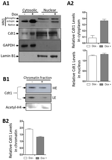 DU-145 cells were stabilized with the HM-HN1 inducible system, and the cells were processed for cellular fractionations for cytosolic, nuclear, and chromatin separation (Figure 9). Western blotting confirmed HN1 induction upon Doxycycline treatment in cytosolic and nuclear fractions of DU-145 cells. Here, we observed that the replication origin licensing factor, Cdt1 levels, increased in the cytoplasm in HN1 overexpressed samples with a decrease in chromatin fractions. In the nuclear fraction, Cdt1 levels remained unchanged upon HN1 overexpression. Since the HN1 phospho-form is observed higher in the nuclear fraction, the data suggested that the S phase increase in HN1 levels has to be kept at a certain threshold to keep the Cdt1 function normal, whereas the increase in HN1 expression leads to Cdt1 retention in the cytoplasm. In PC3 cells, HN1 itself was not observed in the chromatin fraction of the lysates and therefore has not been shown.