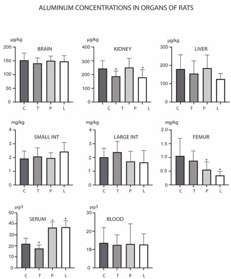 Concentrations of aluminum in the brain, kidney, liver, small intestine, large intestine, serum, blood and femur after the three-month oral administration of silicates. C denotes the control group; T denotes the experimental group receiving tribomechanically activated zeolite clinoptilolite (TMAZ); P denotes the experimental group receiving the double tribomechanically activated zeolite clinoptilolite (PMA zeolite); and L denotes the experimental group receiving Ludox silica. Asterisk (*) denotes significant differences between the experimental groups, with control at p < 0.05.