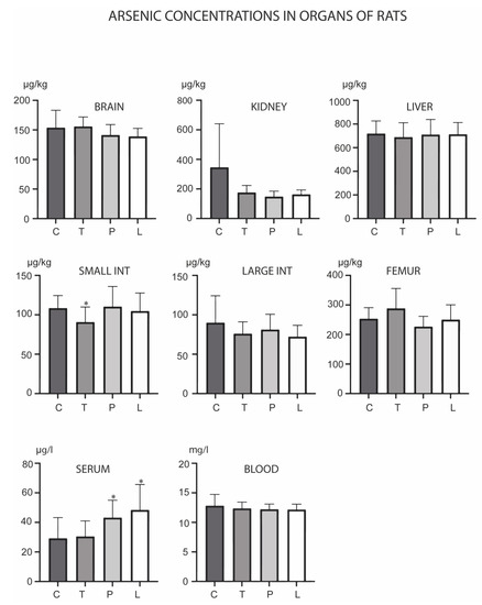 Concentrations of arsenic in the brain, kidney, liver, small intestine, large intestine, serum, blood and femur after the three-month oral administration of silicates. C denotes the control group; T denotes the experimental group receiving TMAZ; P denotes the experimental group receiving PMA; and L denotes the experimental group receiving Ludox silica. Asterisk (*) denotes significant differences between the experimental groups, with control at p < 0.05.