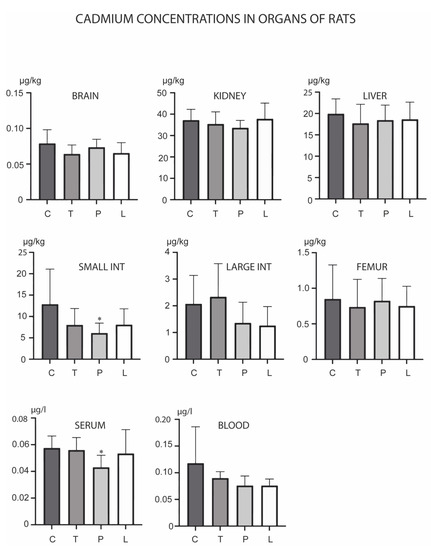Concentrations of cadmium in the brain, kidney, liver, small intestine, large intestine, serum, blood and femur after the three-month oral administration of silicates. C denotes the control group; T denotes the experimental group receiving TMAZ; P denotes the experimental group receiving PMA; and L denotes the experimental group receiving Ludox silica. Asterisk (*) denotes significant differences between the experimental groups, with control at p < 0.05.