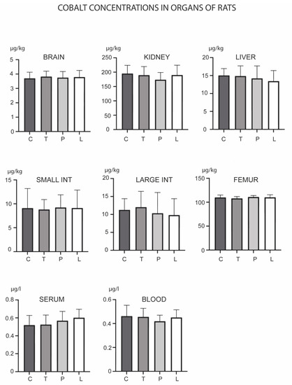 Concentrations of cobalt in the brain, kidney, liver, small intestine, large intestine, serum, blood and femur after the three-month oral administration of silicates. C denotes the control group; T denotes the experimental group receiving TMAZ; P denotes the experimental group receiving PMA; and L denotes the experimental group receiving Ludox silica. Asterisk (*) denotes significant differences between the experimental groups, with control at p < 0.05.