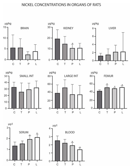 Concentrations of nickel in the brain, kidney, liver, small intestine, large intestine, serum, blood and femur after the three-month oral administration of silicates. C denotes the control group; T denotes the experimental group receiving TMAZ; P denotes the experimental group receiving PMA; and L denotes the experimental group receiving Ludox silica. Asterisk (*) denotes significant differences between the experimental groups, with control at p < 0.05.