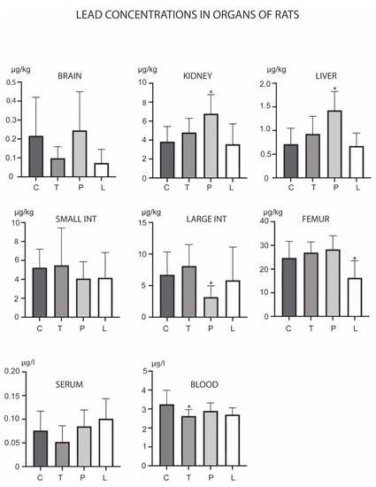 Concentrations of lead in the brain, kidney, liver, small intestine, large intestine, serum, blood and femur after the three-month oral administration of silicates. C denotes the control group; T denotes the experimental group receiving TMAZ; P denotes the experimental group receiving PMA; and L denotes the experimental group receiving Ludox silica. Asterisk (*) denotes significant differences between the experimental groups, with control at p < 0.05.