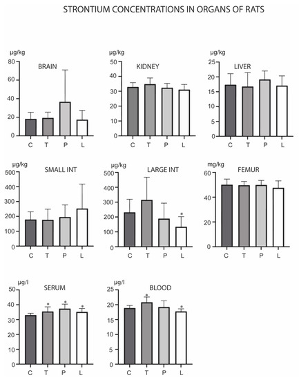 Concentrations of strontium in the brain, kidney, liver, small intestine, large intestine, serum, blood and femur after the three-month oral administration of silicates. C denotes the control group; T denotes the experimental group receiving TMAZ; P denotes the experimental group receiving PMA; and L denotes the experimental group receiving Ludox silica. Asterisk (*) denotes significant differences between the experimental groups, with control at p < 0.05.