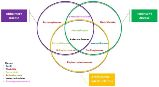 Several bacterial and prokaryotic phyla are implicated in dysbiotic processes related to the onset of neurodegenerative diseases. The Akkermansiaceae and Prevotellaceae families are increased in Alzheimer’s, Parkinson’s, and ALS patients. Likewise, prokaryotic Bacteroidiaceae families are present in AD and ALS. In contrast, the Lachnospiraceae and Peptostreptococcaeae are respectively less numerous in these diseases. Opposite patterns of bacterial abundance were found in the Bifidobacteriaceae families between AD and ALS; in the Oscillospiraceae, and in Lactobacillaceae between PD and ALS [23,30,42].