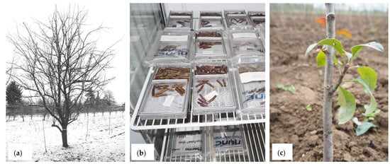 Cryopreservation of dormant Pyrus buds: (a) Trees of P. pyraster during winter-time in January; (b) Single bud sections during the dehydration step at a temperature of –5 °C; (c) Recovery of P. elaeagrifolia buds after cryopreservation in the orchard.