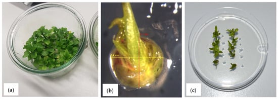 Cryopreservation of Pyrus by using PVS2 vitrification: (a) Donor material in vitro shoots; (b) Explant of P. korshinskyi-shoot tip with four primordia; (c) Recovery of P. ×bretschneideri shoot tips after cryopreservation.