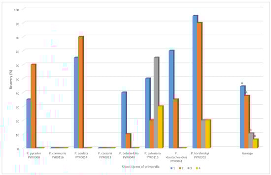 Cryopreservation of Pyrus by using PVS2 vitrification: Recovery rate (%) of Pyrus ssp. shoot tips after cryopreservation depending on the size of the explant. For each variant = 20 shoot tips. Means with the same letters are not significantly different (p ≤ 0.05).