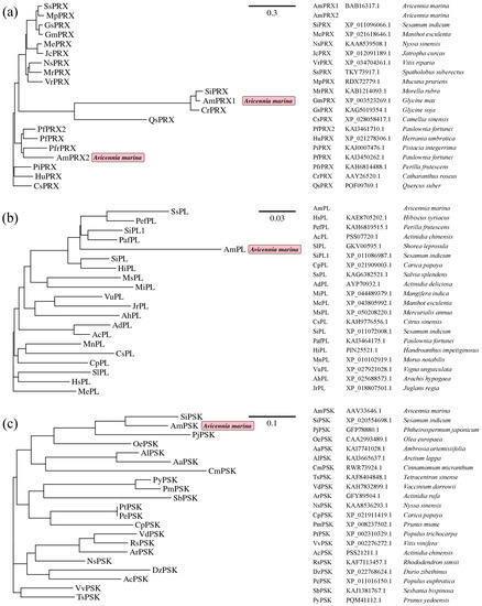 Figure 1. Phylogenetic tree generated using the (a) PRX, (b) PL, and (c) PSK proteins of various plant species. Abbreviations of 49 plant species and the GenBank accession numbers for each protein are shown in brackets.