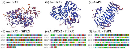 Figure 2. Three-dimensional models of AmPRX1 (a), AmPRX2 (b), and AmPL (c) proteins and alignment AmPRX1 and SiPRX (d), AmPRX2 and PfPRX (e), AmPL and PefPL (f). The protein models were constructed by molecular modeling in SWISS-MODEL. Color represents the estimated per-residue inaccuracy (blue and red indicate more reliable and potentially unreliable regions, respectively).