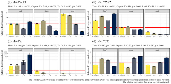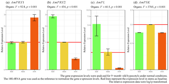 Furthermore, the organ-specific expression patterns of AmPRX1, AmPRX2, AmPL, and AmPSK genes in A. marina under normal conditions were analyzed via RT-qPCR. These four genes were detected in all organs (leaves, stems, and roots) but with differences in expression levels (Figure 3, ANOVA, p < 0.05). AmPRX1 exhibited a preference for expression in the root (Figure 3a). The expression levels of AmPRX2 and AmPL were the highest in the leaves (Figure 3b,c), followed by stems and roots. Meanwhile, the AmPSK gene displayed comparable transcript levels among leaves, stems, and roots (Figure 3d).