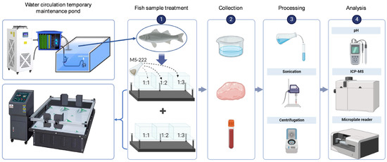 The results of the pre-experiment allowed us to determine the best concentration of MS-222 (30 mg/L), which can make the sea bass achieve deep anesthetic effect. After temporary cultivation, the temperature was decreased from 20~22 °C to 12 °C at a rate of 3 °C/h. The other parameters of the transport water were the same as those of the cultured water. The sea bass was treated with 30 mg/L MS-222 and divided into three treatment samples: the transport density was 1000 g/L (fish to water ratio was 1:1, MS-1-1), 500 g/L (fish to water ratio was 1:2, MS-1-2), and 333.3 g/L (fish to water ratio was 1:3, MS-1-3), respectively. The sea bass was not treated with MS-222 and divided into three treatment samples: the transport density was 1000 g/L (fish to water ratio was 1:1, NMS-1-1), 500 g/L (fish to water ratio was 1:2, NMS-1-2), and 333.3 g/L (fish to water ratio was 1:3, NMS-1-3), respectively. The samples of sea bass without transport or addition of MS-222 were used as control (CK). Then, the fish was stocked in a live fish transport box with cold water (12 °C) and subjected to simulated transport for 72 h. The number of fish used in each sample was 30. The simulated transport was listed as follows: 1 h on a B-level road (80 km/h) → 4 h on an A-level road (100 km/h) → 1 h on a B-level road (80 km/h) and repeated 12 times. Five sea bass were randomly selected for sampling after being transported for 72 h, and the sea bass samples were recovered for 12 h in the cultured water at room temperature and selected for sampling. The survival rate of the animals in each sample was determined [25,26]. The experimental design process is shown in Figure 1.