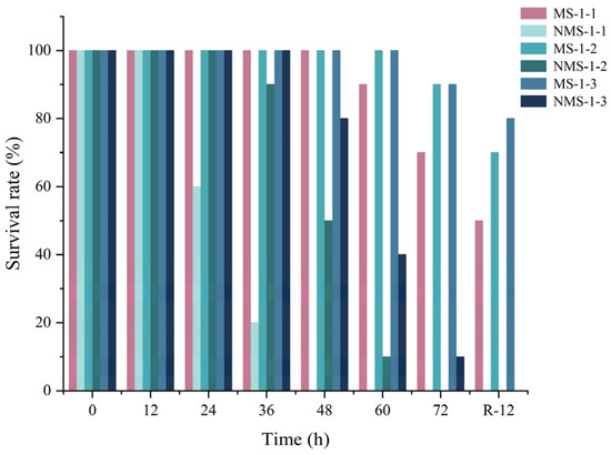 The survival rate of sea bass in treatment samples and basal samples during and after transport. MS-1-1: 30 mg/L MS-222, fish to water ratio was 1:1; NMS-1-1; fish to water ratio was 1:1; MS-1-2: 30 mg/L MS-222, fish to water ratio was 1:2; NMS-1-2: fish to water ratio was 1:2; MS-1-3: 30 mg/L MS-222, fish to water ratio was 1:3.; NMS-1-3: fish to water ratio was 1:3.