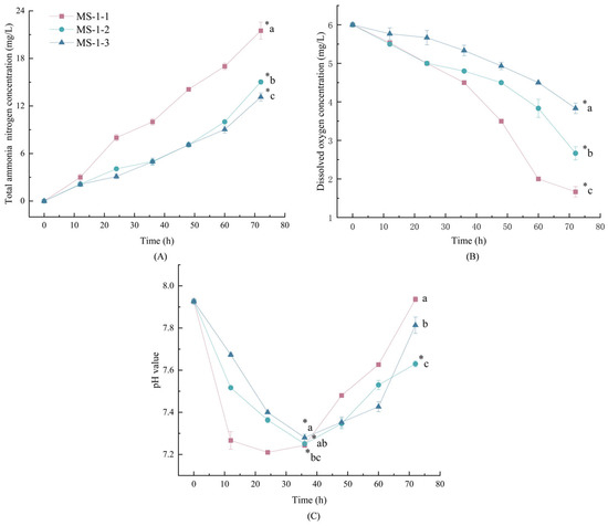 The changes in total ammonia nitrogen concentration (A), dissolved oxygen concentration (B), and pH value of transport water (C) in different treatment samples during live transport. Vertical bars indicate standard deviation. Asterisk (*) represents significant differences (p < 0.05) at transporting for 0 h and after transport. Different lowercase letters represent significant differences among three treatment samples at the same time during live fish transport.
