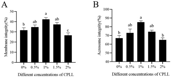Effects of CPLL supplementation at 0% to 2.0% level to the freezing medium on post-thaw goat sperm membrane integrity (A) and acrosome integrity (B). Values are specified as mean ± standard deviation (SD). Columns with different lowercase letters differ significantly (p < 0.05).