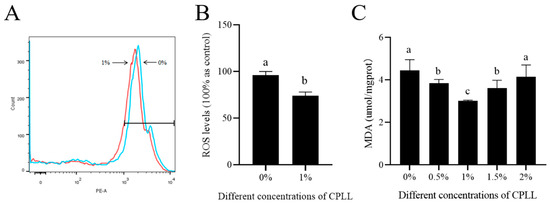 Effects of CPLL on goat sperm ROS content and MDA level after freezing-thawing. (A) Flow cytometer peak for ROS and (B) the ROS content compared between 1% CPLL and control. (C) The MDA level at different concentrations of CPLL supplemented to the freezing medium. Values are specified as mean ± standard deviation (SD). Columns with different lowercase letters differ significantly (p < 0.05). MDA: malondialdehyde; ROS: reactive oxygen species.