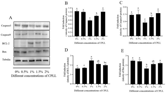 Sperm apoptosis was detected in terms of Caspase-3, Caspase-9, BCL-2, and Bax by the western blot method with Tubulin as control (Figure 5A and Supplementary Figure S1). It was observed that the expression of Caspase-3 and Caspase-9 was significantly decreased in the 1% and 1.5% CPLL groups compared to other CPLL (0.5% and 2.0%) and control groups (Figure 5B,C; p < 0.05). The addition of 1% and 1.5% CPLL to the extender significantly (p < 0.05) increased the expression of BCL-2 in the frozen-thawed sperm; however, no improvement (p > 0.05) was observed in 0.5% and 2.0% CPLL groups compared to those of the control (Figure 5D). The level of Bax was significantly (p < 0.05) decreased by 1.0% CPLL supplementation to the freezing extender; however, the other treatments (0.5%, 1.5%, and 2.0%) showed a similar (p > 0.05) expression as compared to those of the control.