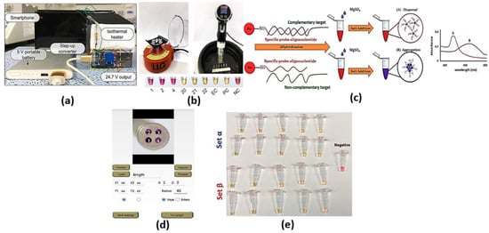 (a) Front side and back side of the i-Genbox LAMP box [21], (b) Left—mini-centrifuge used for DNA precipitation and preparation of the LAMP reaction mix; right—sous-vide stick heating water to different temperatures in a rubber ice bucket; bottom—results of 6 samples to test the simple setup relying on visual readout [22], (c) A schematic illustration of LAMP-GNP/DNA probe assay [23], (d) The interface of the smartphone app for hue value quantitative measurement [20] and (e) LAMP primer sets α and β, which can enable the amplification of synthetic samples of SARS-CoV-2 nucleic acids in a wide range of template concentrations [24].